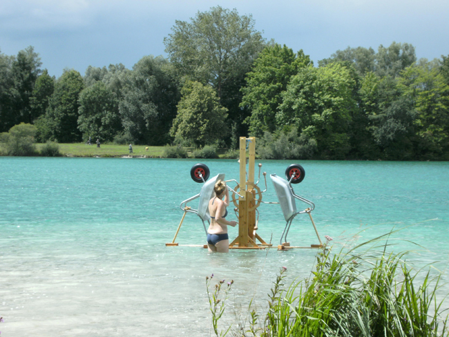 2012 Seh am See, »Belärmung für eine bessere Welt« Karlsfelder See • Kunst an der Isar »Landshuter Meter 2012« ein Stäbestaccato mit 5000 Stäben über die Isar Landshut Erstellung eines Films